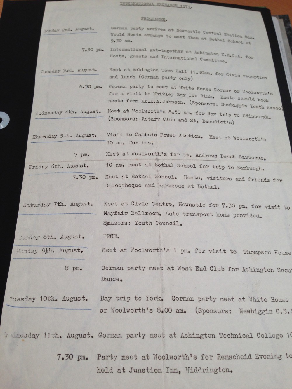 Nach 45 Jahren habe ich immer noch engen Kontakt zu einem der „Mädchen“. Unsere Kinder besuchen sich gegenseitig und zu wichtigen Familienfeiern laden wir uns ein. Noch heute amüsieren wir uns über die Ereignisse von damals. Wir trafen uns meist am „White House Corner“ oder Woolworth zu Ausflügen nach Edinburgh, York, Bamburgh, zum Mayfair Ballroom in Newcastle und zur Eisbahn nach Whitlay Bay. Diese wurden vom Rotary Club, St. Benedict´s, Youth Council, Newbiggin Youth Associaton, Newbiggin C.S.School und Hirst Park Boys gesponsert. Wer kennt nicht den abgelaufenen Teppich im „White Elephant“, wo wir „Baby Cham“ getrunken haben? Unser Jugendaustausch ging über mehrere Jahre, da die deutschen und englischen Schwestern auch reisten – unvergessene Erlebnisse.